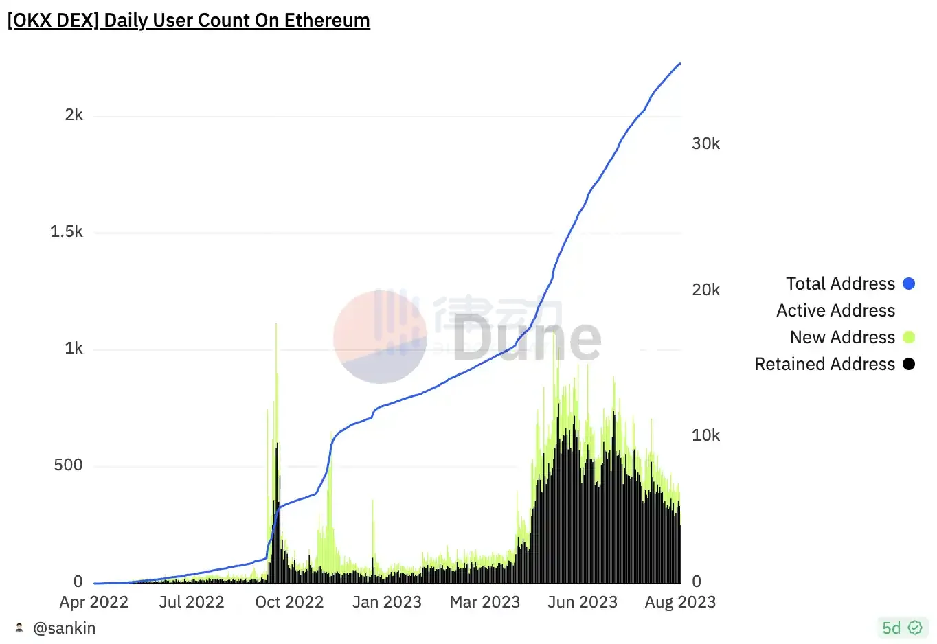 据 Dune 数据显示,OKX DEX 用户数量从今年 4 月份进入爆发式增长,其中以太坊链上每日用户地址总数已从年初的 12205 增长至 6 月份的 28383,增幅超过 130%。此外,OKX DEX 聚合的 DEX 数量已经从 100+到 300+,涨幅超过 200%,跨链网桥数量从 3+到 15+;支持的公链数量从 10+到 20+。